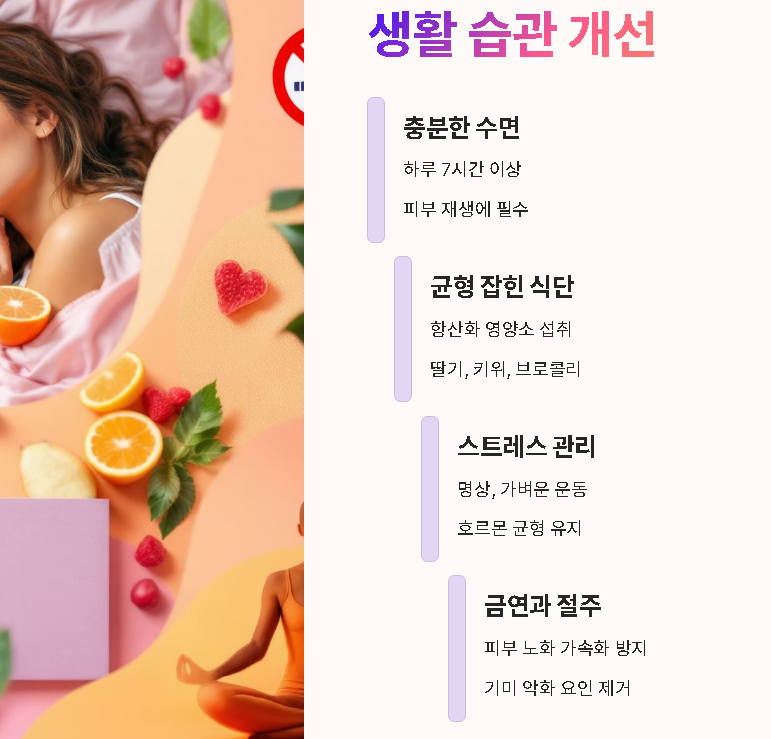 수면 부족은 피부 재생을 방해하고 색소 질환을 악화시킬 수 있으므로, 하루 7시간 이상의 수면을 권장합니다.