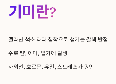 - 기미: 대칭적으로 퍼지고 경계가 불분명하며, 멜라닌 색소가 진피층까지 침착된 경우가 많음