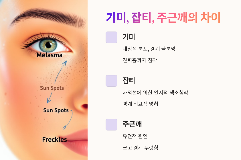 - 잡티: 자외선에 의한 일시적 색소침착으로 비교적 경계가 명확함