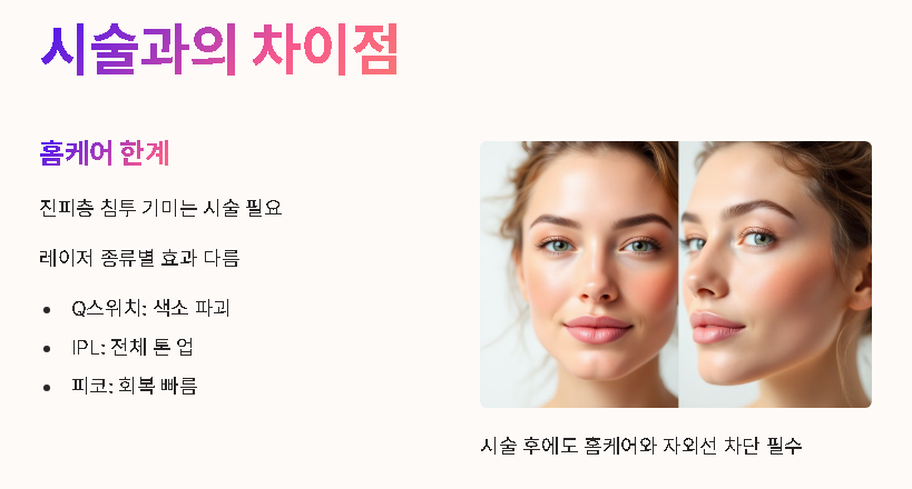 - 피코 레이저: 피코초 단위의 정밀한 조사로 진피·표피 색소 모두 제거 가능, 회복 빠르고 부작용 적음