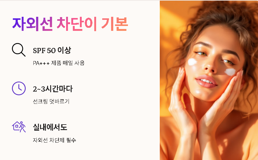 기미 관리의 핵심은 자외선 차단입니다. SPF 50 이상, PA+++ 제품을 매일 사용하는 것이 중요하며, 실내에서도 자외선은 존재하므로 외출하지 않는 날에도 선크림을 발라야 합니다. 2~3시간마다 덧발라야 효과적입니다.